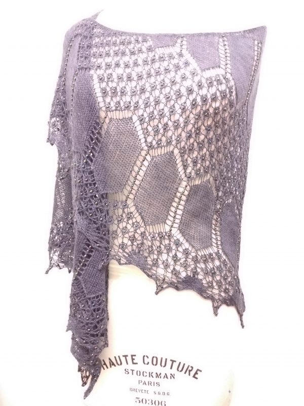 Dans la vie de toute personne qui tricote, ce moment arrive où on ressent le besoin urgent de tricoter de la dentelle perlée. Du moins, ce moment arriva dans ma vie, une fois de plus, alors j’ai commencé à fouiller Ravelry en espérant trouver le patron parfait qui assouvirait mon besoin. Mais, malgré l’abondance de magnifiques modèles de châles en dentelle perlée, aucun d’entre eux ne satisfaisait tous mes critères. J’ai donc décidé de me lancer et de créer mon propre modèle, où des larges sections de jersey côtoieraient de la dentelle très aériennes et lourdement perlée. Ainsi est né Questions in a World of Blue, inspiré par le symbole de la grotte aux hiboux dans la célèbre série américaine Twin Peaks.